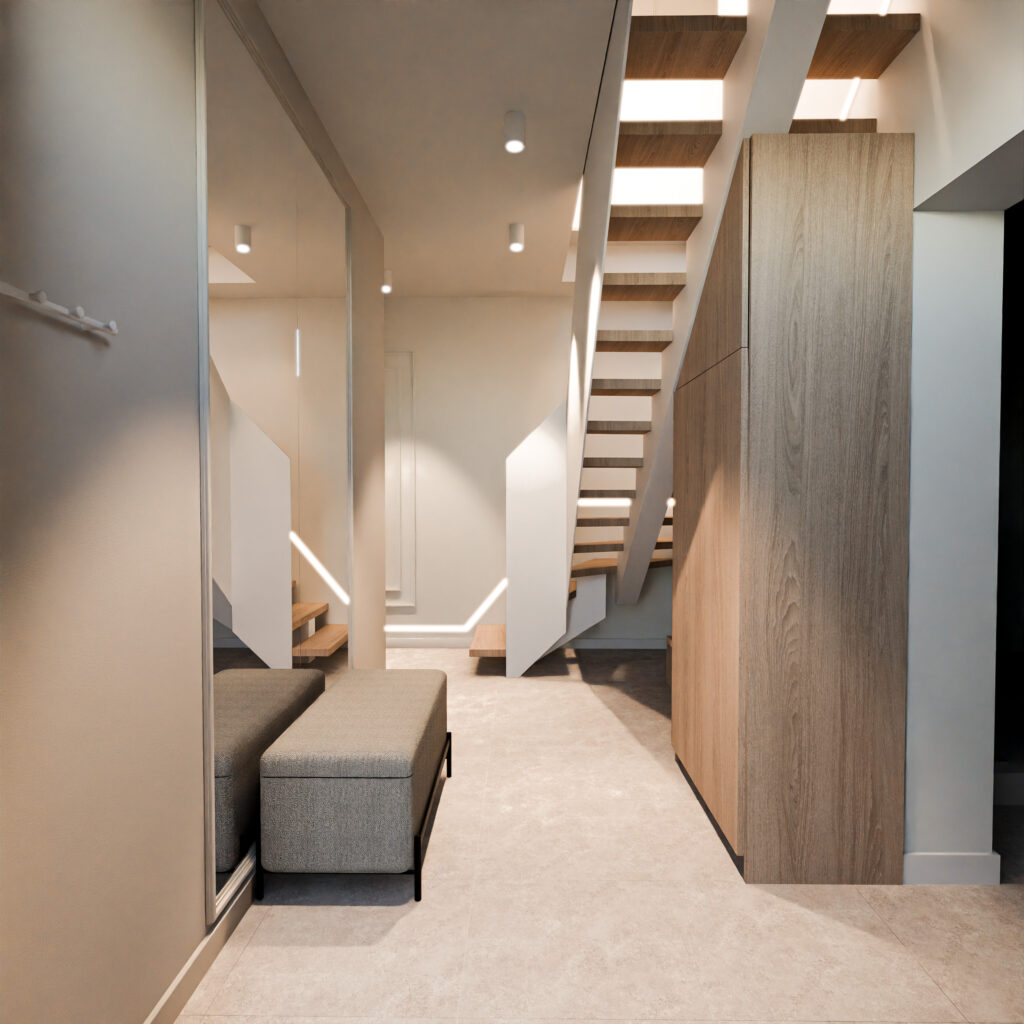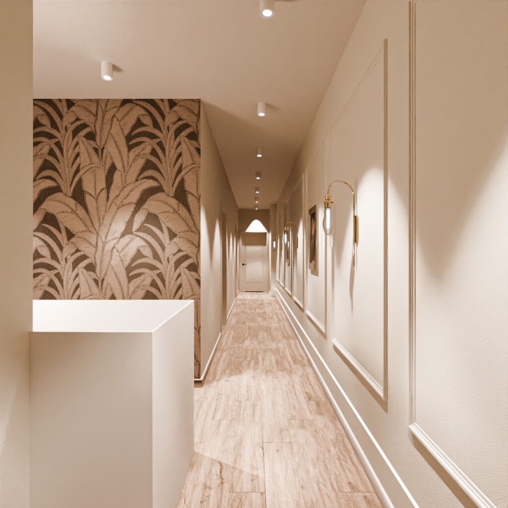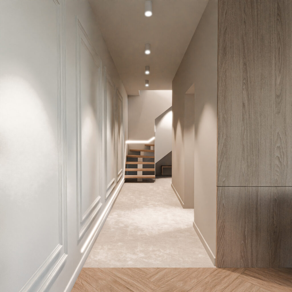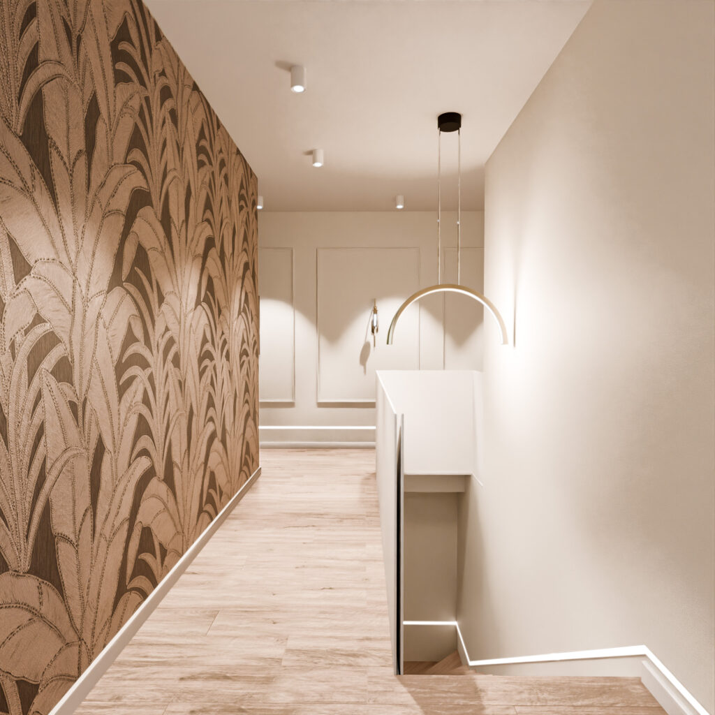 Projekt: Pruszków IIRok: 2025 Projekt wnętrz pomieszczeń wspólnych oraz korytarza na piętrze.Projekt wnętrz w stylu Nowoczesnym z akcentami dekoracyjnymi w stylu klasycystycznym.