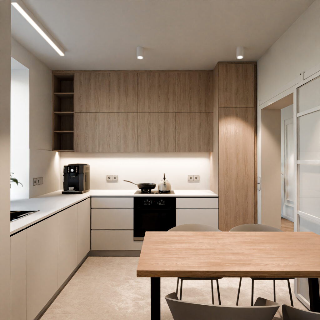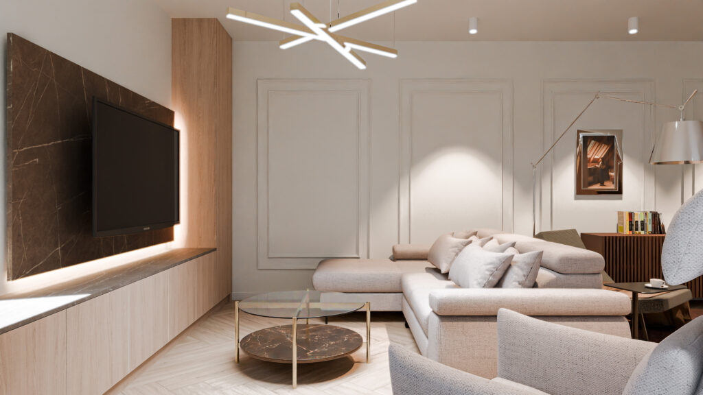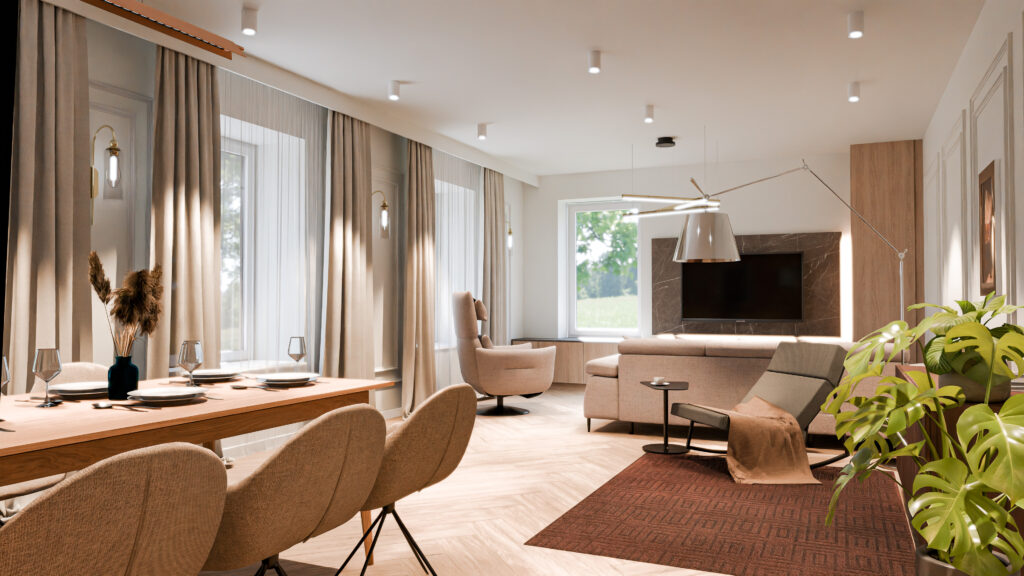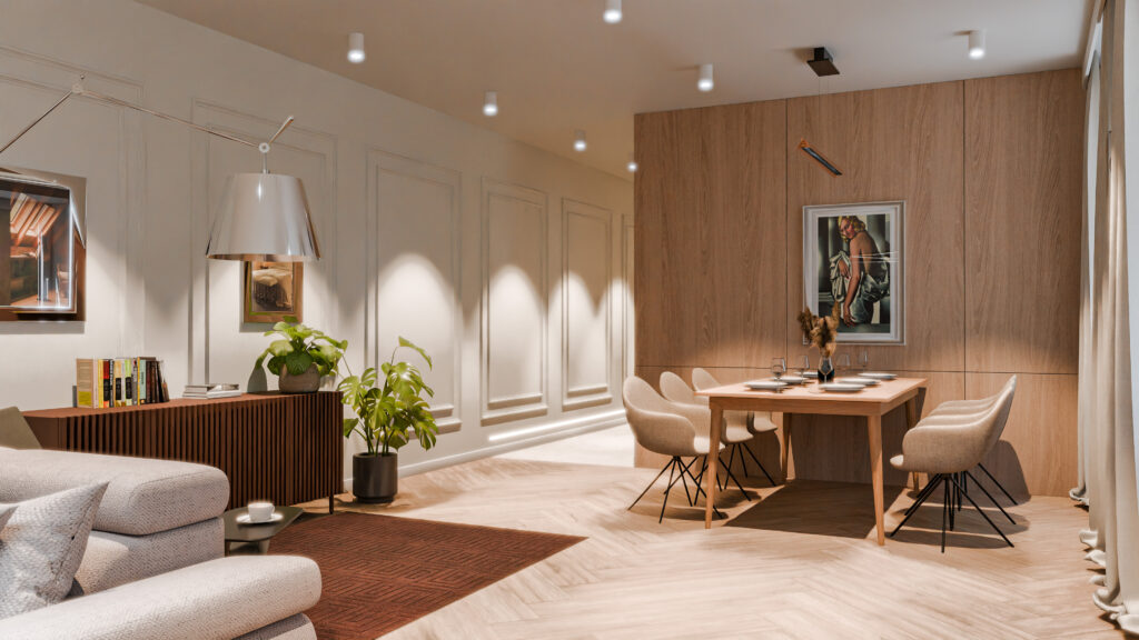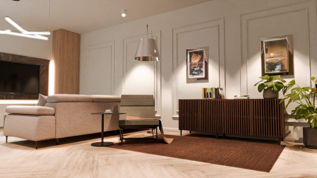 Projekt: Pruszków IIRok: 2025 Projekt wnętrz pomieszczeń wspólnych oraz korytarza na piętrze.Projekt wnętrz w stylu Nowoczesnym z akcentami dekoracyjnymi w stylu klasycystycznym.