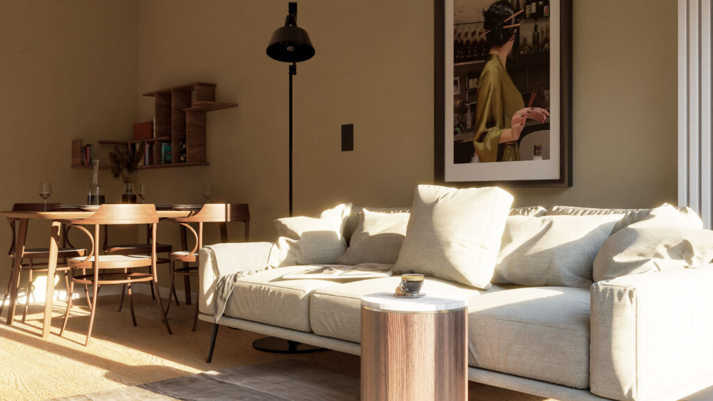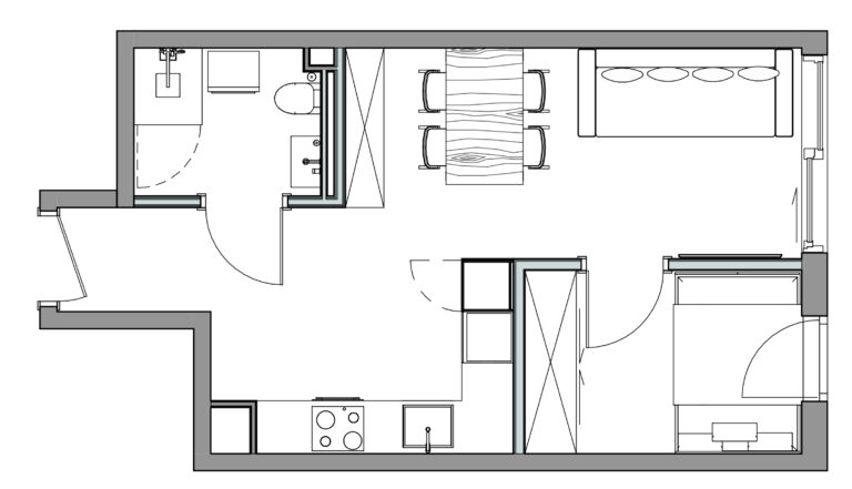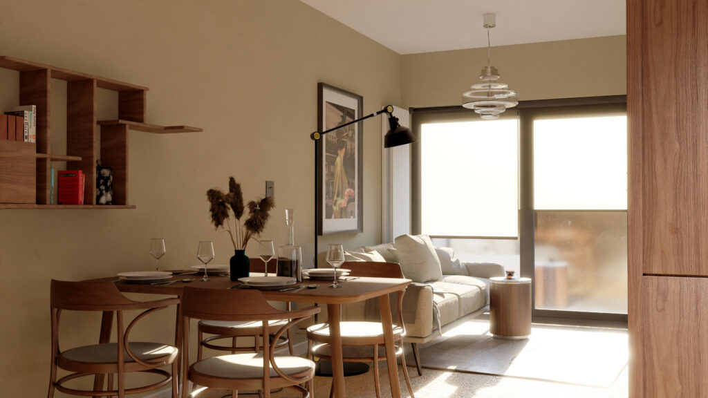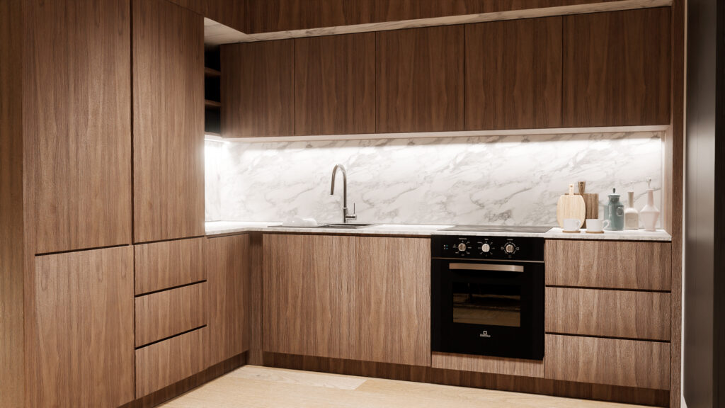 Projekt: Warszawa, Wola Rok: 2022 Projekt wnętrz mieszkania 36 m2. Naturalne, ciemne odcienie, oliwkowa zieleń i drewno. Przestronna kuchnia dla amatora gotowania ze strefą dzienna i strefą nocną.