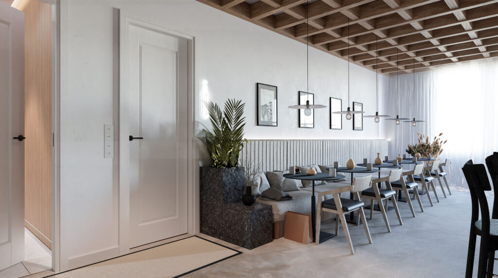 Projekt: LegionowoRok: 2021 Projekt wnętrz restauracji serwującej kuchnie azjatycką. Czerpiąc, ze stylu japandi, zaprojektowana przestrzeń wyróżnia prostota formy, naturalność kolorystyczna i akcenty nawiązujące do kultury japońskiej.